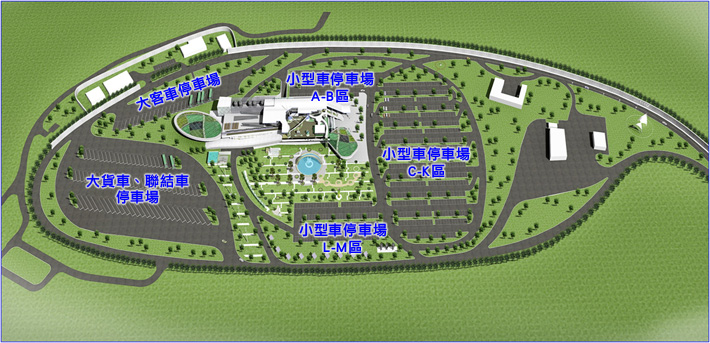 停車場動線圖形化標誌牌面,明顯易懂,並規劃分區及編號,方便旅客尋車;設置無障礙停車位、 孕婦及育有六歲以下兒童者車位、復康巴士上下車處等,提供不同需求之民眾使用。 小型車停車場:總計737車位(含小型車709位、無障礙專用停車位:14車位、孕婦及育有六歲以下兒童者車位:14車位、第2停車場小客車55車位) 第2停車場:大貨車:66車位,聯結車:31車位(假日結合第2停車場小型車位,轉為132應變車位) 大客車停車場:大客車32車位