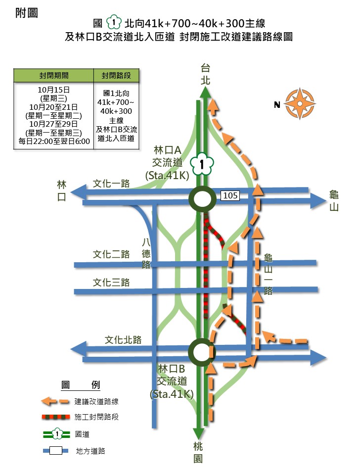 114年10月15日、20至21日及27至29日,每日夜間10時至翌日上午6時,施工封閉國道1號41k+700至40k+300北向主線及林口B交流道北入匝道