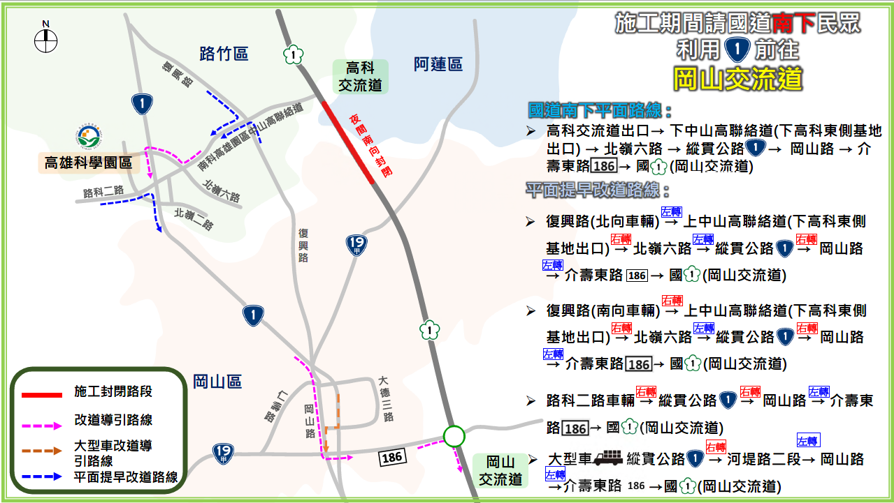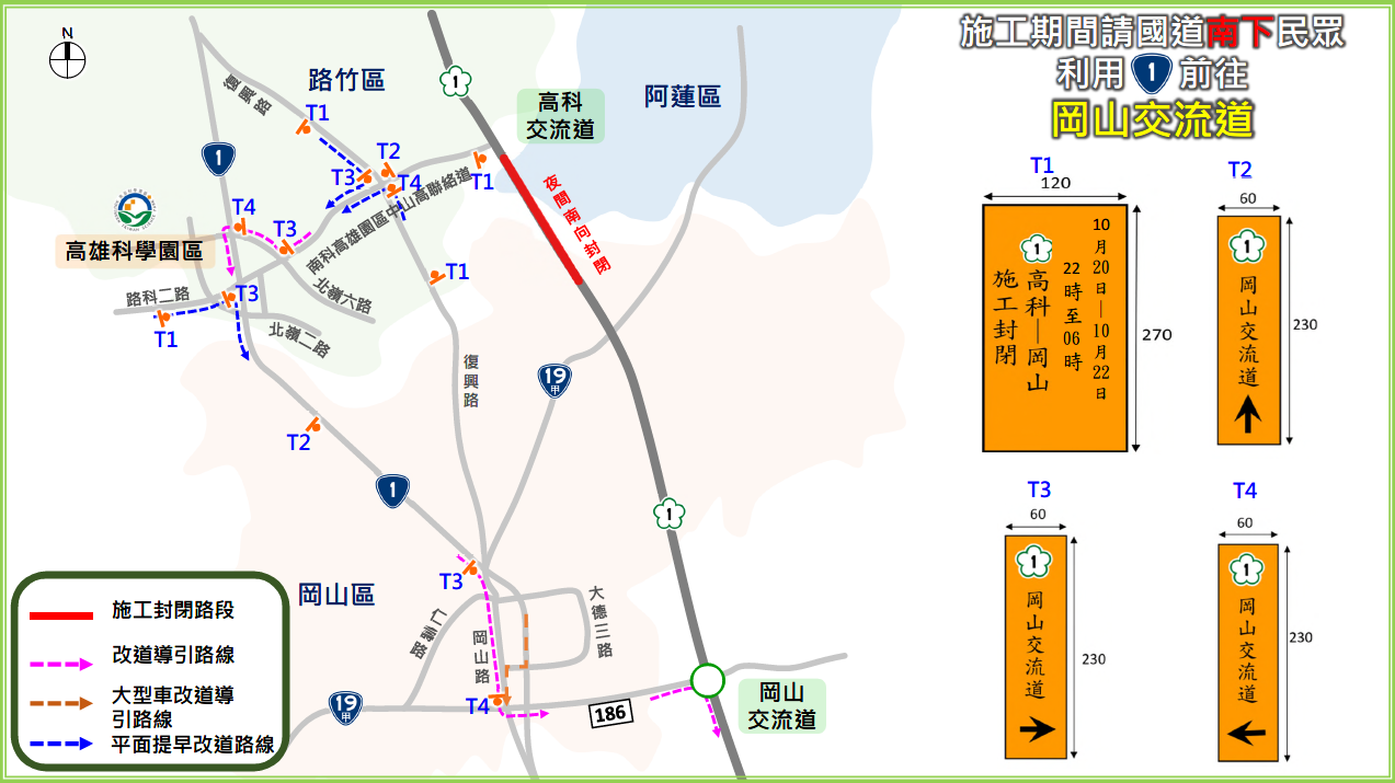 【施工封閉】114年10月20日(星期一)至10月22日(星期三)每日夜間22時至翌日6時止封閉國道1號南下高科交流道(342k)至岡山交流道(349k)路段。