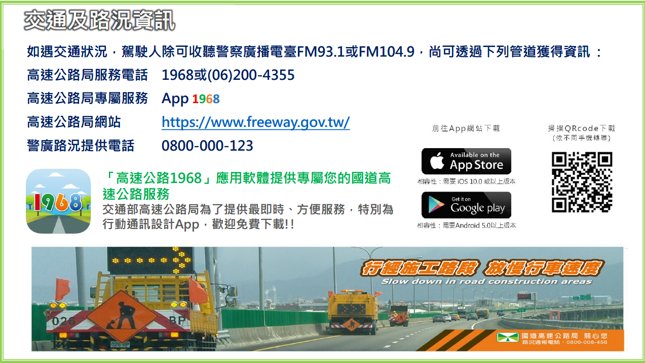 六、用路人如需進一步了解相關訊息,可利用高速公路局1968APP或撥打1968(路況查詢專線)、 (06)200-4355(交通部高速公路局第二新建工程分局第三工務所)查詢,或上高公局官網(https//www.freeway.gov.tw/)、高速公路1968網站(https://1968.freeway.gov.tw/n_whatsup)、交通部高速公路局第二新建工程分局官網(https://www.freeway.gov.tw/SEO/)查詢道路管制資訊。