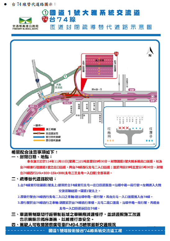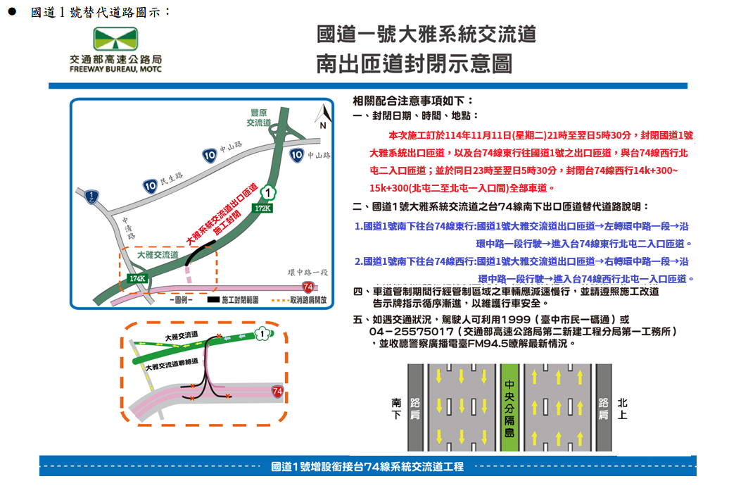 【施工封閉】預計於114年11月11日(星期二)21時至翌日5時30分,封閉國道1號大雅系統出口匝道,以及台74線東行往國道1號之出口匝道,與台74線西行北屯二入口匝道;並於同日23時至翌日5時30分,封閉台74線西行14k+300~15k+300(北屯二至北屯一入口間)全部車道。