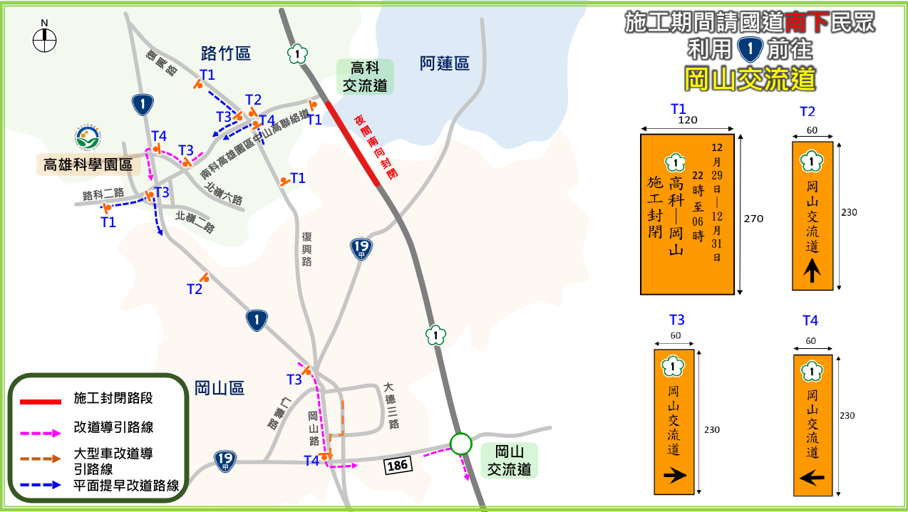 【施工封閉】114年12月29日(星期一)及12月30日(星期二)每日夜間22時至翌日6時止封閉國道1號南下高科交流道(342k)至岡山交流道(349k)路段