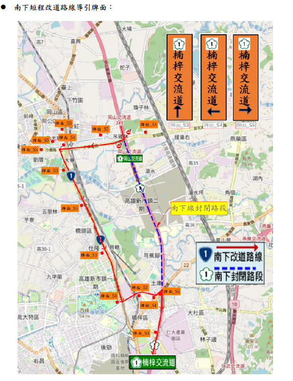 二、施工期間行經國道1號南下往楠梓方向用路人,建議改道路線如下: