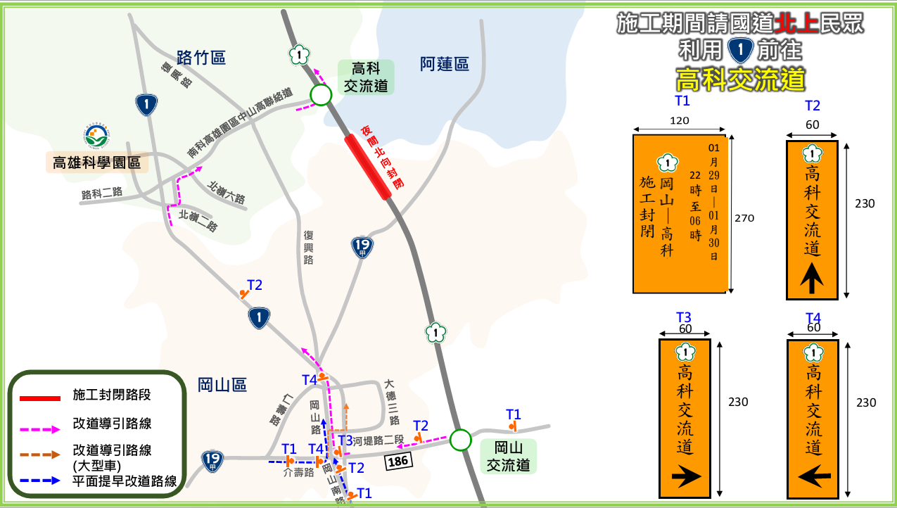 一、為進行「國道1號土庫排水橋改善工程(第B103標)」主線線型調整作業,預計於115年01月29日(星期四)22時至115年01月30日(星期五)06時止,封閉國道1號岡山交流道(349k)至高科交流道(342k)。