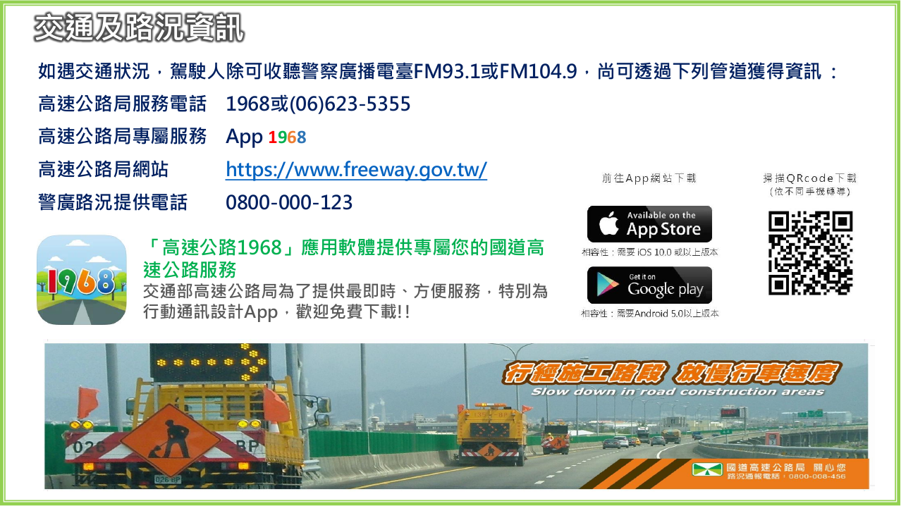 五、用路人如需進一步了解相關訊息,可利用高速公路局1968APP或撥打1968(路況查詢專線)、 (06)623-5355(交通部高速公路局第二新建工程分局第三工務所)查詢,或上高公局官網(https//www.freeway.gov.tw/)、高速公路1968網站(https://1968.freeway.gov.tw/n_whatsup)、交通部高速公路局第二新建工程分局官網(https://www.freeway.gov.tw/SEO/)查詢道路管制資訊。