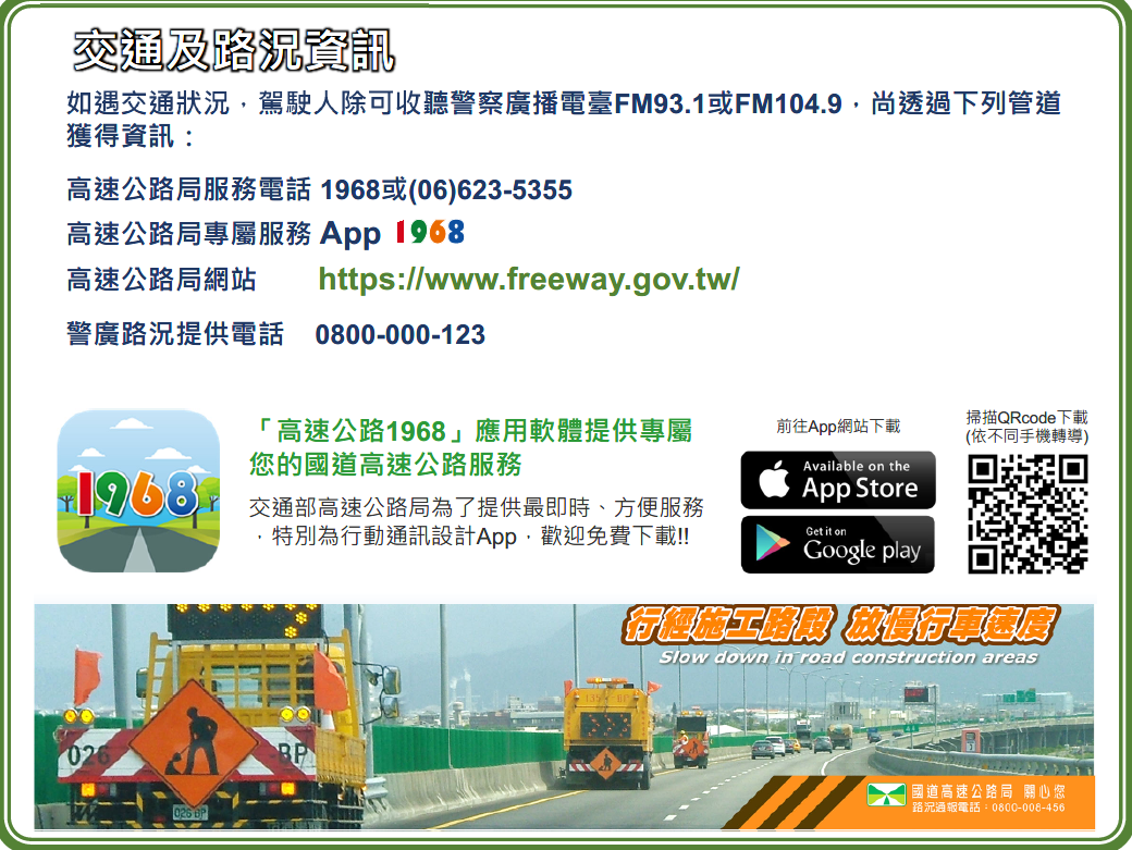 六、用路人如需進一步了解相關訊息,可利用高速公路局1968APP或撥打1968(路況查詢專線)、 (06)623-5355(交通部高速公路局第二新建工程分局第三工務所)查詢,或上高公局官網(https//www.freeway.gov.tw/)、高速公路1968網站(https://1968.freeway.gov.tw/n_whatsup)、交通部高速公路局第二新建工程分局官網(https://www.freeway.gov.tw/SEO/)查詢道路管制資訊。