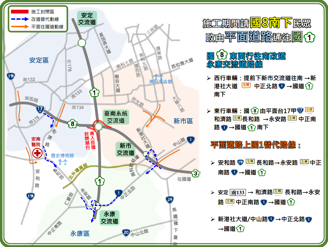 【施工封閉】115年2月9日(星期一)及115年2月10日(星期二)每日夜間21:00至翌日06:00 止,全面封閉臺南系統交流道(315K)南下入口匝道(國8往國1南下)