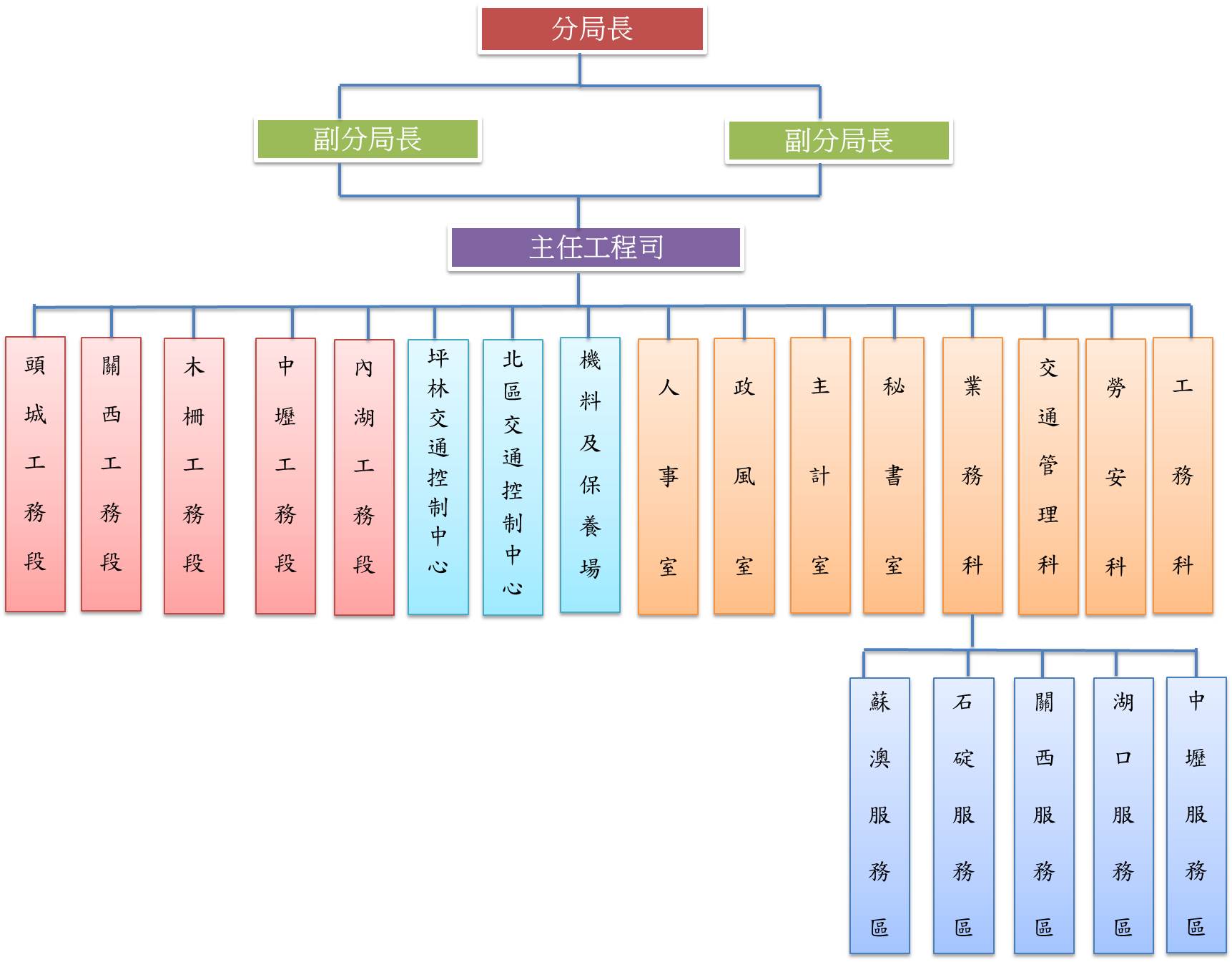 本分局設4科(工務、勞安、交通管理、業務)、4室(秘書、政風、人事、主計)、機料及保養場、5段(內湖、中壢、木柵、關西、頭城)、5服務區(中壢、湖口、關西、石碇、蘇澳)、北區交通控制中心及坪林交通控制中心。