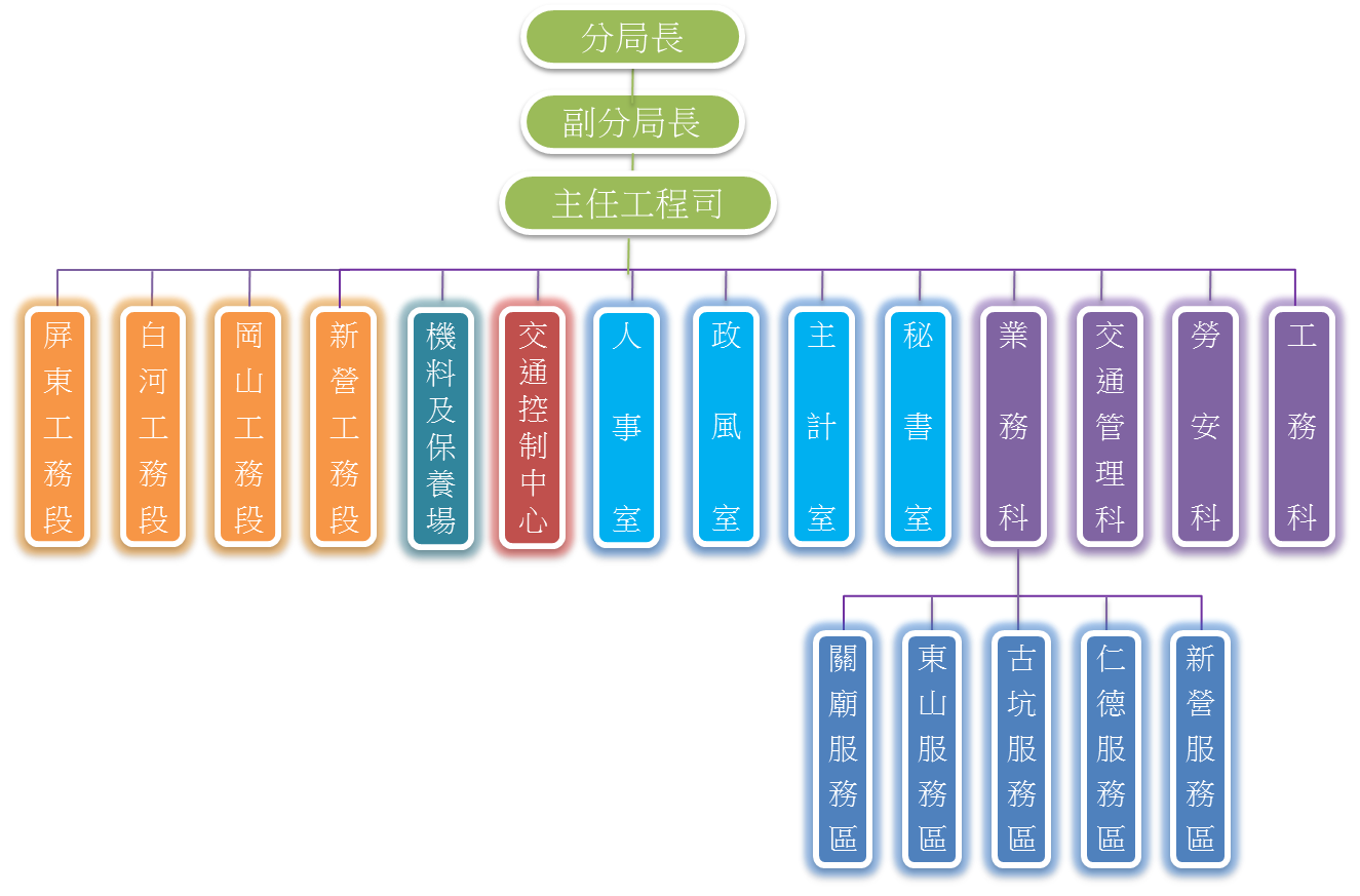 本分局轄區里程共337.437公里,各路段負責維護管理之工務段為:國道1號251k+100~320k及國道8號全線由新營工務段負責;國道1號320k~374k+320及國道10號0k~18k+400由岡山工務段負責;國道3號270k~358k由白河工務段負責;國道3號358k~431k+525及國道10號18k+400~33k+782由屏東工務段負責。