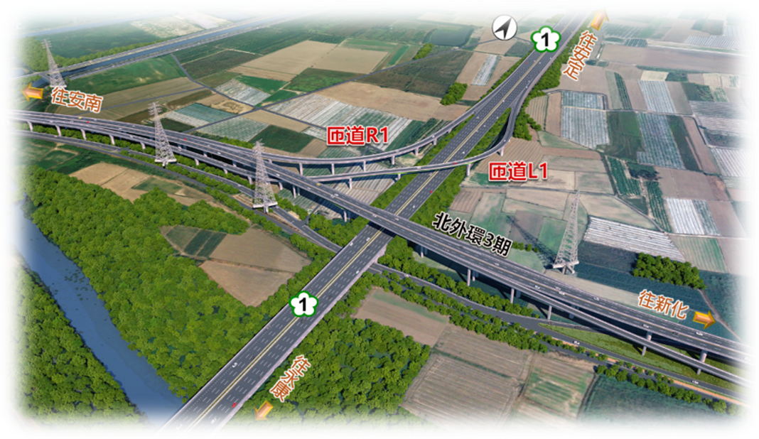 三、計畫內容:臺南市政府分4期辦理北外環道路(屬市區快速道路),其中第1期(南科聯絡道至高鐵橋下道路)已完工通車,擬第3期(台江大道至南科聯絡道)工程於跨越國道1號處(約317k+500)增設交流道。