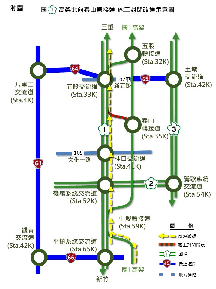 利用泰山轉接道欲至五股、新莊、泰山、三重之用路人,請繼續行駛汐五高架至環河北路下出口匝道改行地方道路前往,或請提早於中壢轉接道改行國1平面道路行駛前往目的地。