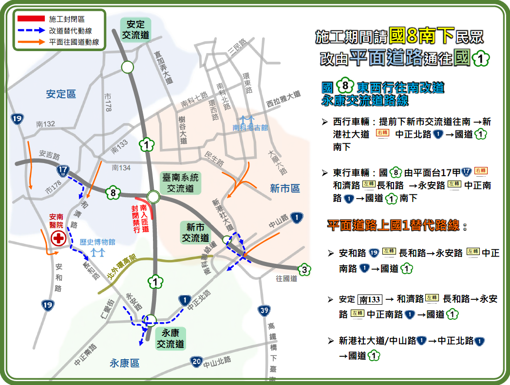 • 國道8號主線及平面道路往國1南下車輛替代路線:請透過省道台19、鄉道南133、省道台1 由永康交流道往南。