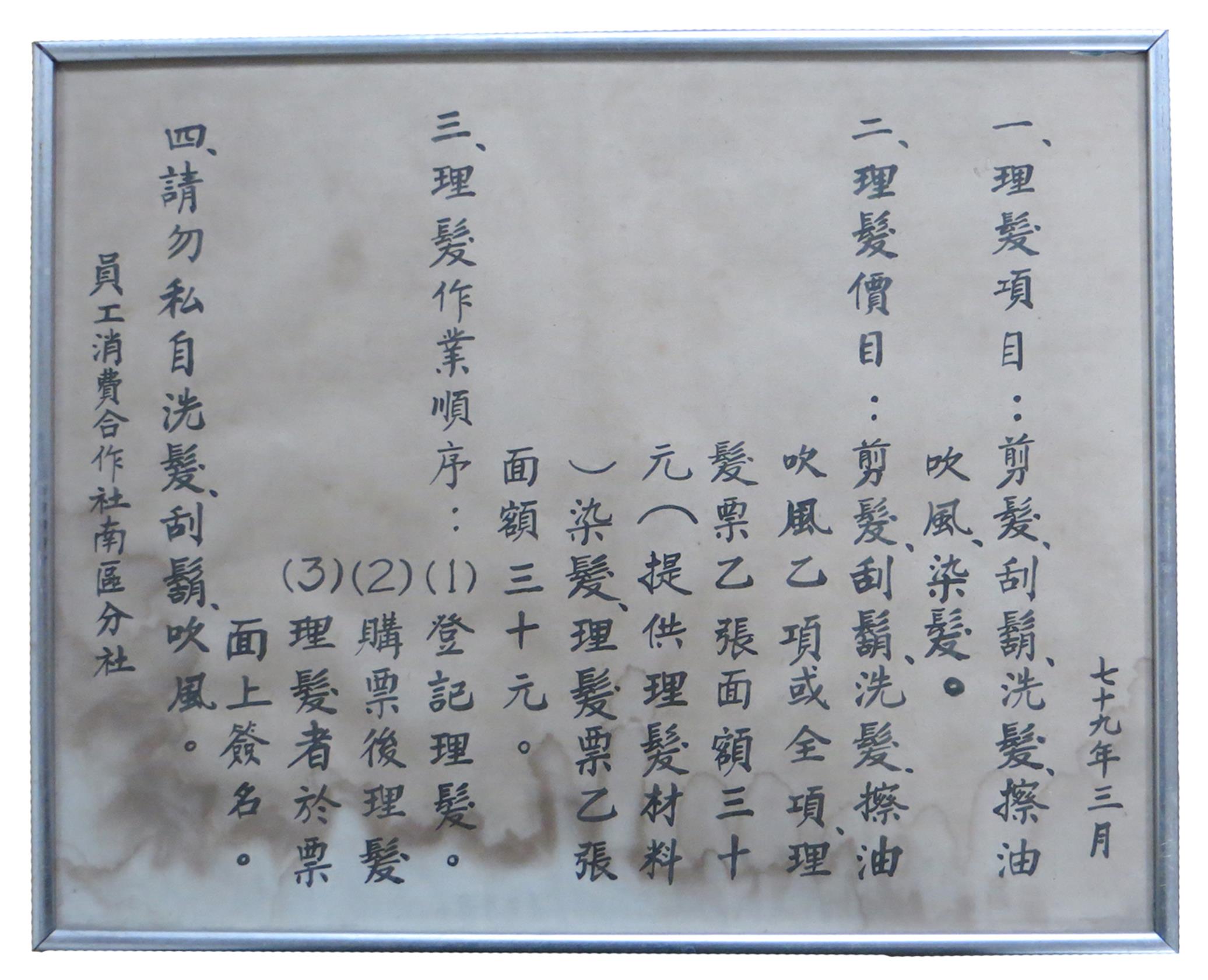 員工福利社理髮規定裱框及理髮卷-早期公務員薪資低,機關會設置員工福利委員會,並設置員工福利社及理髮項目,理髮師會定期到各工務段幫員工理髮,員工依其項目購買理髮卷消費。