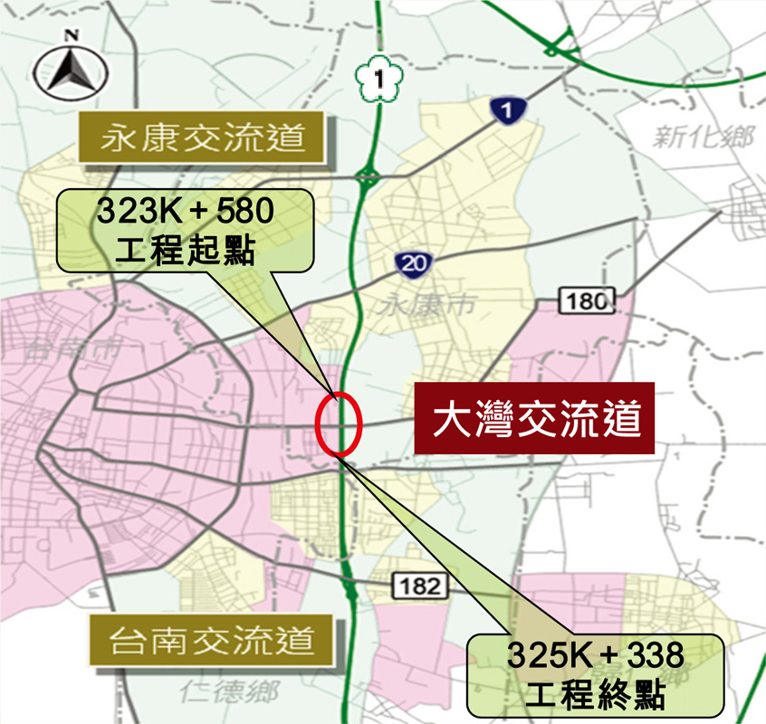 國道1號增設大灣交流道因地形關係採半鑽石型設計,以縣道180(復興路)為主要連絡道路,設有南下出口匝道”S1”及北上入口匝道”N1”;另配合地方交通運轉需求,於連絡道縣道180南側約160公尺處增設迴轉道穿越橋及縣道180道路拓寬等工程,本工程於102年3月18日開工,工期791日曆天,預定104年5月17日完工,契約金額新台幣4億2,200萬元整,截至102年9月15日,預定進度2.24%,實際進度4.29%,進度超前2.05%,整體施工團隊之精神非常積極,本標工程完工後將帶給當地鄉親便捷的交通。