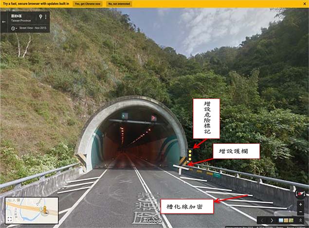 增設護欄延伸至隧道內適當處以維順接及導引功能,另為配合路寬變化路段增設部頒「道路交通標誌標線號誌設置規則」之危險險標記「危1類」,以促進行車安全並將路側槽化線劃線加密方式,防止駕駛人駛入而撞擊隧道壁面及隧道人行步道(如附圖1)。 |