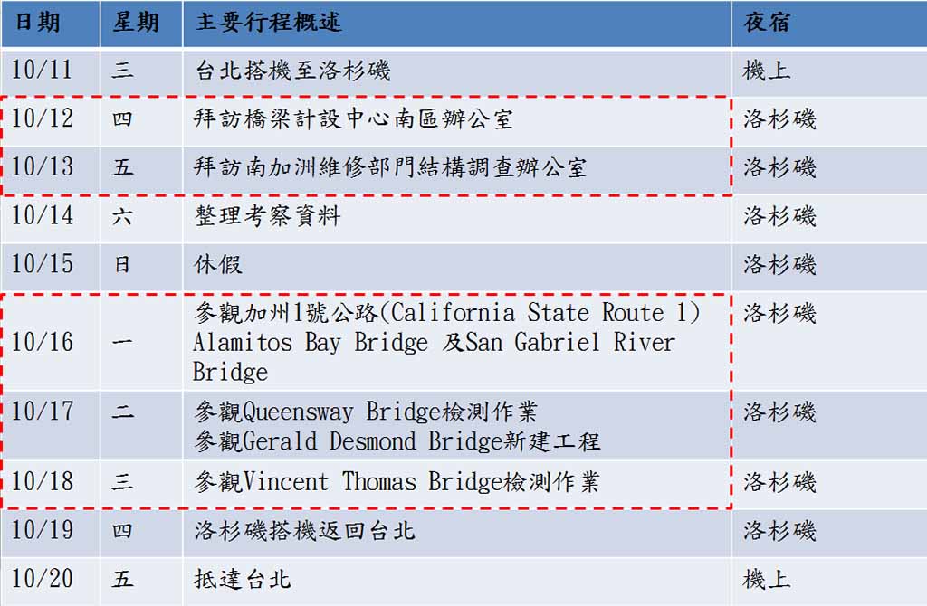 本次考察主要目的在於藉由派員觀摩CalTrans在橋梁新建、評估檢測及養護等技術的發展情形,從中學習其經驗,瞭解CalTrans在橋梁方面之新建、結構維修與調查作業情形,作為本局相關橋梁業務未來推動與發展之參考。