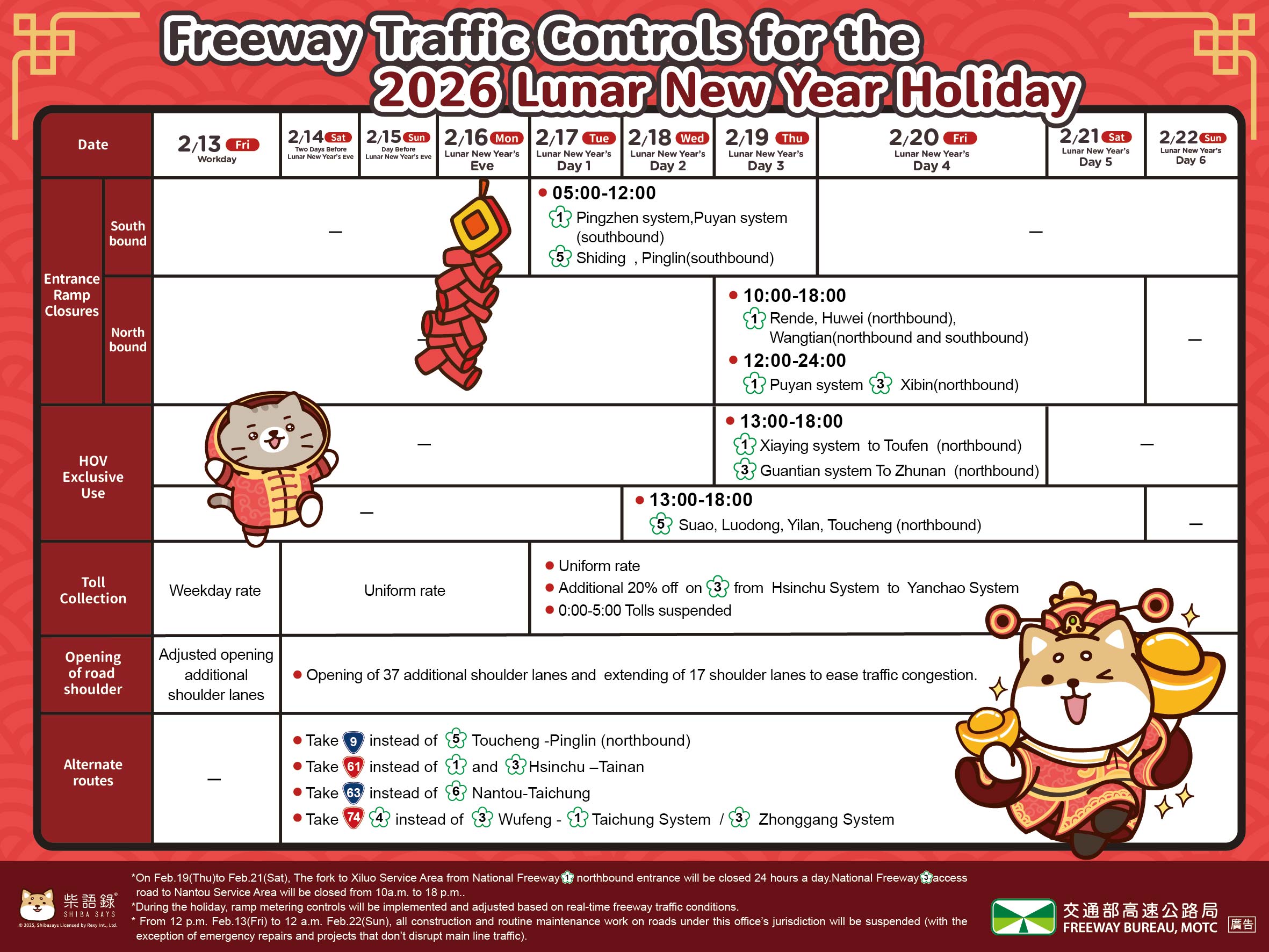 2/13(五)12時至2/22(日)24時本局所轄路段全線暫停施工及例行養護作業(緊急搶修及不影響主線交通之工程除外)。