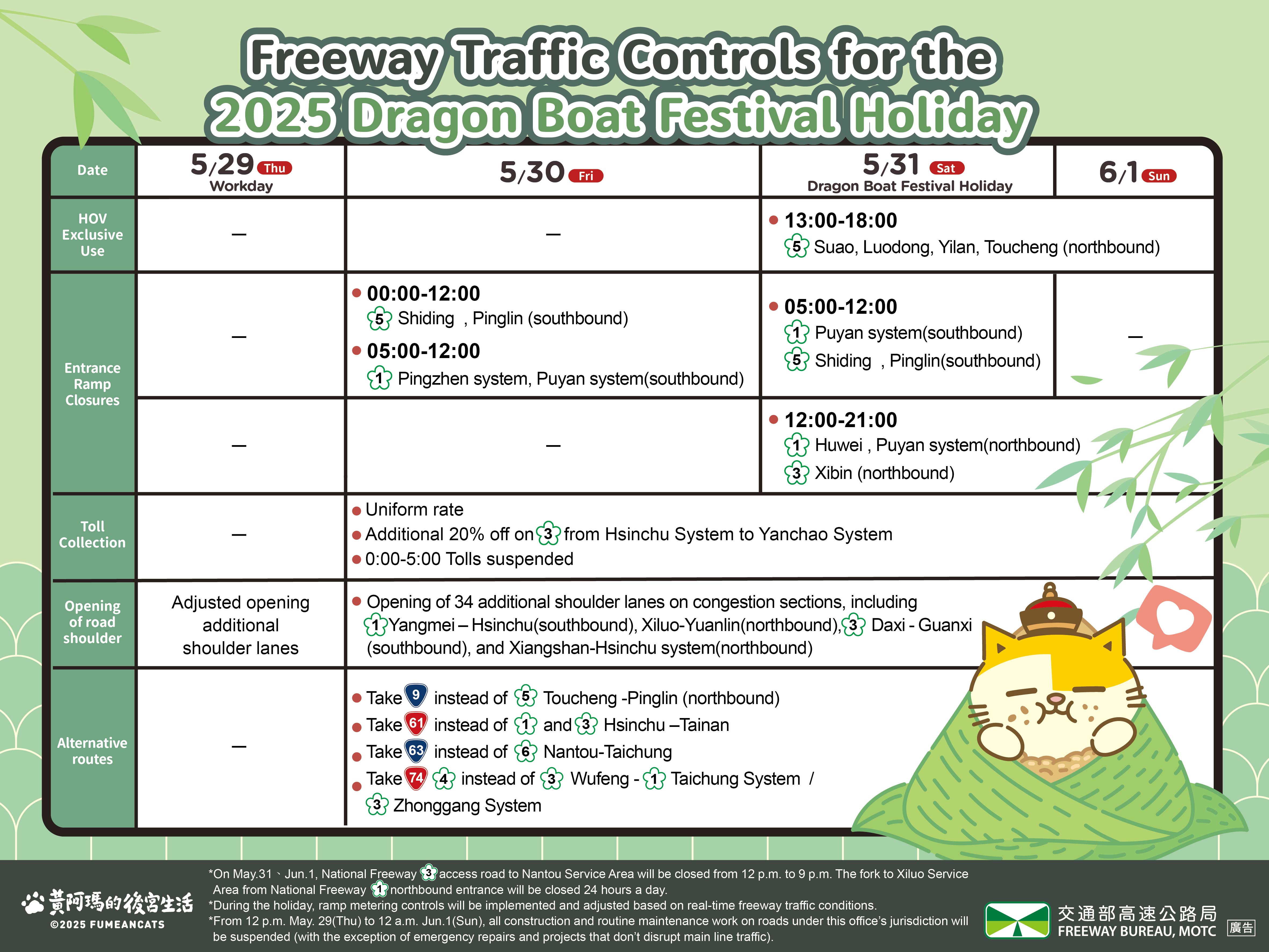 5/29(四)12時至6/1(日)24時本局所轄路段全線暫停施工及例行養護作業(緊急搶修及不影響主線交通之工程除外)。