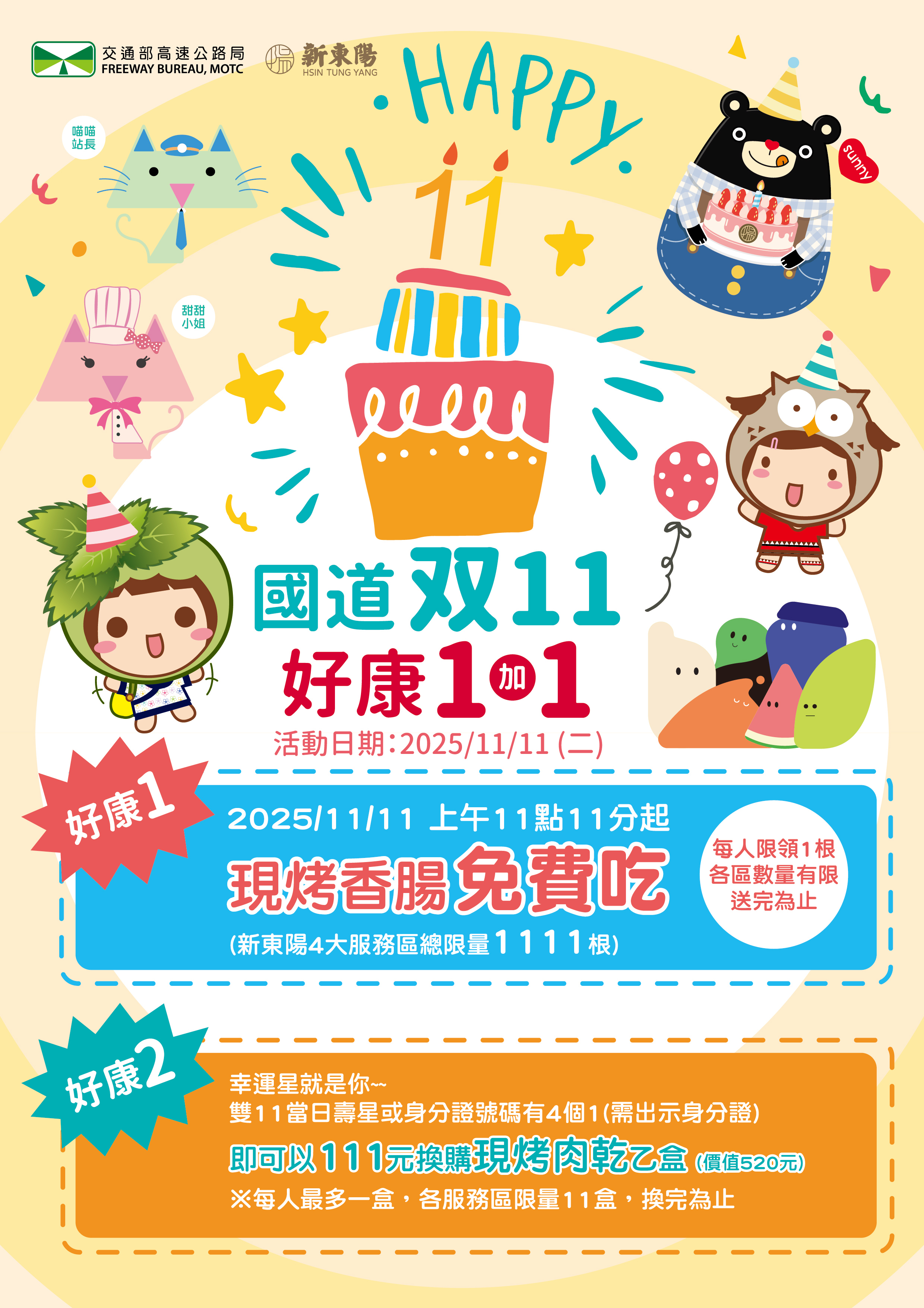 好康1:11/11(二) 上午11點11分起 新東陽夯肉乾專櫃現烤香腸免費吃,西螺服務區限量350根(每人限領1根,數量有限送完為止)。