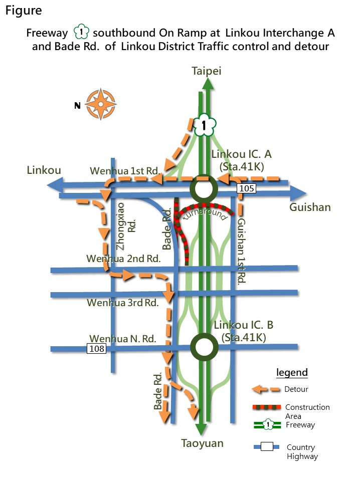 Motorists are going to enter southbound Freeway 1 through interchange ‘A’ can use the south on-ramp interchange ‘B’ for substitute. Vehicles in Linkou District may follow Zhongxiao Road, turn left onto Wenhua 2nd Road, then turn right onto Bade Road again, then keep on straight southbound and take the south on-ramp of Linkou interchange 'B' to enter Freeway 1.