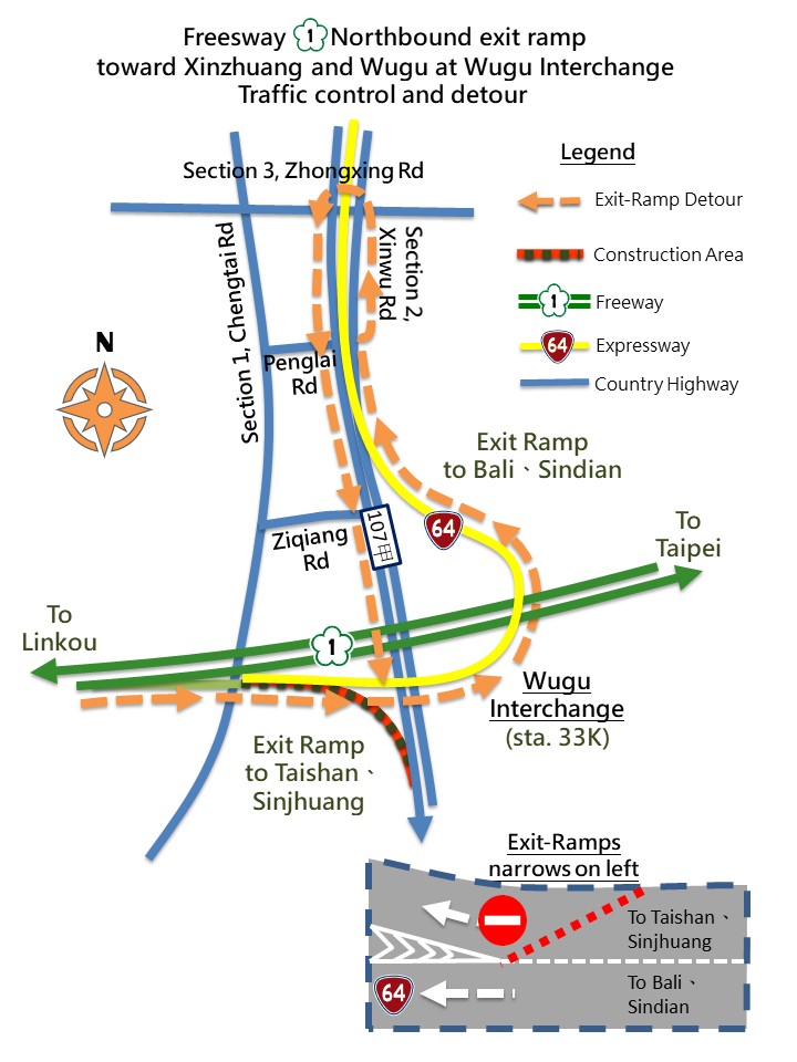 Motorists traveling northbound on Freeway 1 heading toward Taishan and Xinzhuang should instead the left exit ramp toward Bali and Sindian Districts (highway 64) as an alternate route. From Highway 64, drivers can exit from Wugu Interchange, proceed to the Section 2 of Xinwu Road at ground level road in Wugu District, and make a U-turn at the Section 3 of Zhongxing Road intersection, and continue toward Taishan and Xinzhuang.