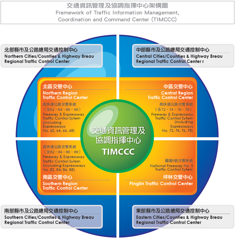In the future, we will set up “Traffic Information Management, Coordination and Command Center” (TIMCCC) which, based on the idea of “managing by region, centralizing of information”, can integrate our four regional traffic control centers to handle traffic information in the freeway network and the 12 east-west expressways. And traffic information regarding local highways will also be included; then users will get the overall and real-time traffic information.
